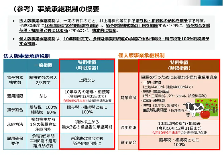 一方で、実際に贈与や相続を行うことができる特例措置の適用期限は従来どおりで、法人版は令和9年(2027年)12月31日まで、個人版は令和10年(2028年)12月31日までです。