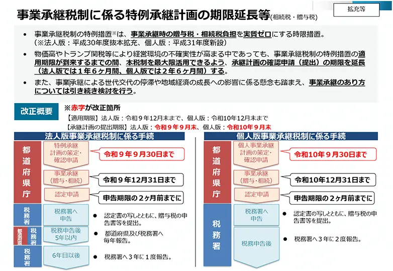 物価高や国際情勢の不安定化(関税問題等)により、先行きが見通しにくい経営環境が続く中でも、事業承継税制を最大限活用できるよう、計画提出期限のみを延長する措置が取られています。